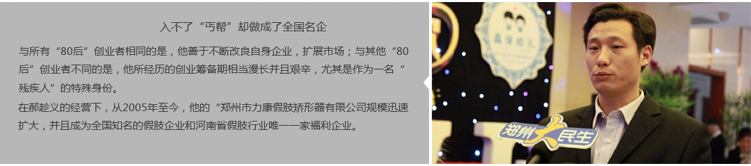 鄭州市力康假肢矯形器有限公司(簡稱力康),是一家專業(yè)從事假肢矯形器的設計、研發(fā)、制作及裝 配的專業(yè)機構。成立于1992年是河南省唯一一家福利企業(yè)。力康下設業(yè)務部、技術部、住院部、康復 部、售后服務部,并配有現代化的裝配車間和功能齊全的訓練大廳,為殘疾朋友康復訓練提供了可靠 保障??偨浝泶┐骷僦嗄?,有著豐富的臨床經驗和親身體會;多年來,力康已為全國幾十萬名殘疾 朋友安裝上舒適、美觀、耐用的假肢和矯形器具,使他們更大限度地恢復了正常的工作和生活?!爱a 品即人品”的質量理念、先進的技術、實惠的價格、完善的售后服務是力康取勝的法寶……
